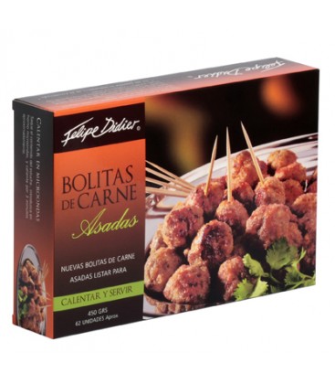 Bolitas pequeñas de cocktail, horneadas y congeladas, elaboradas con carne de vacuno y de cerdo, proteínde soya, huevo, cebolla y perejil fresco.