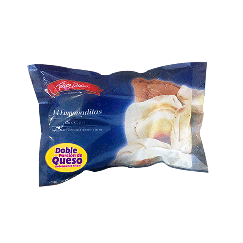 Empanaditas de cocktail congeladas rellenas con doble porción de queso por derretir, masa pre-cocidas, listas para hornear y servir.