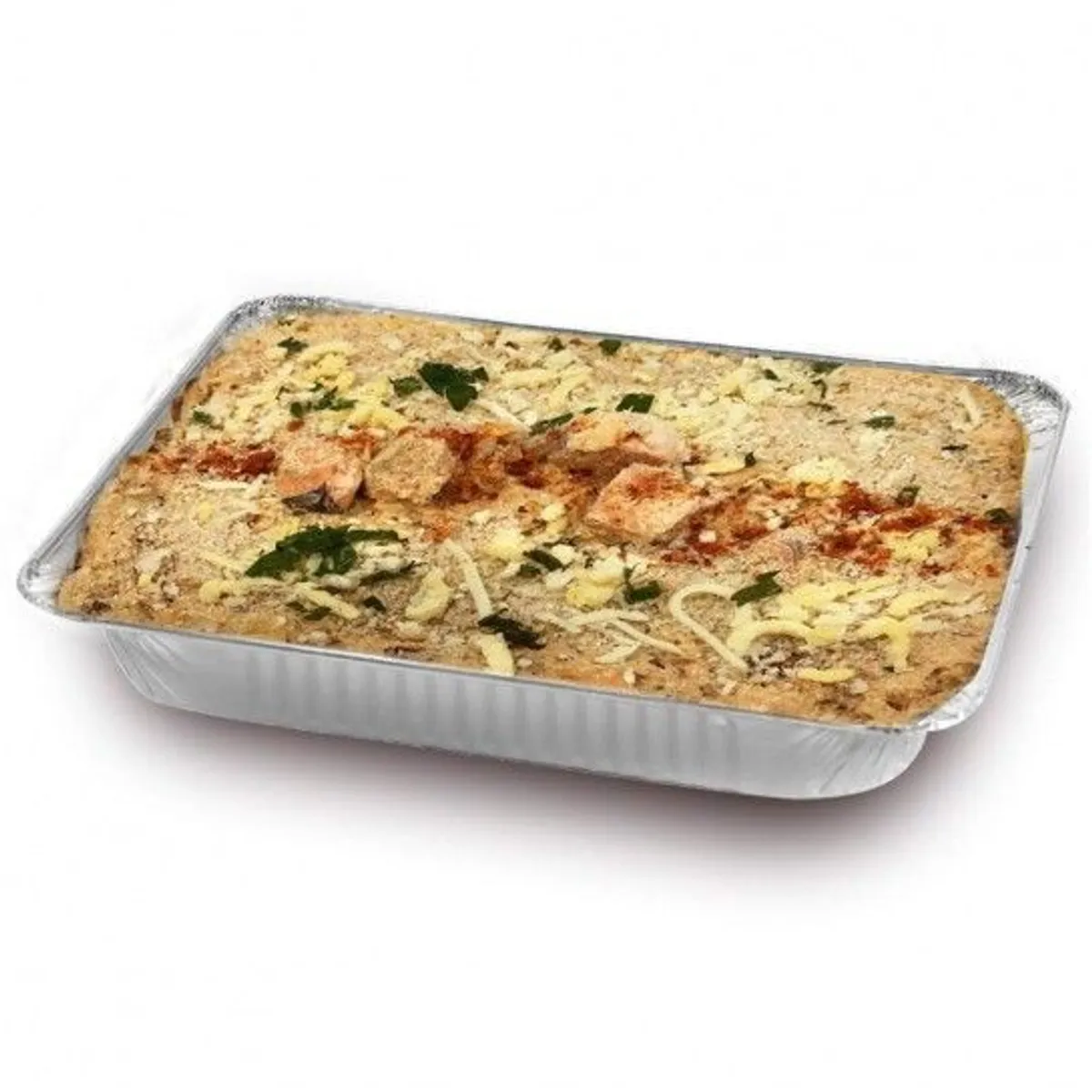 Carne de jaiba, salmón, crema blanca, mantequilla, cebolla, ají en salsa, sal, perejil, ajo y pimienta negra. Decoración: Salmón queso gauda, pan molido, merkén y perejil